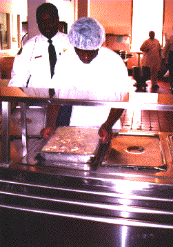 ![]() | Turkey and pastry is spooned into a tray and placed on the serving line. Correction staff supervise the inmates, teaching them to cook, inspecting the quality of meals and making sure the kitchen remains clean. The kitchen crew will eat first and then serve the meal to the prison's other inmates. |